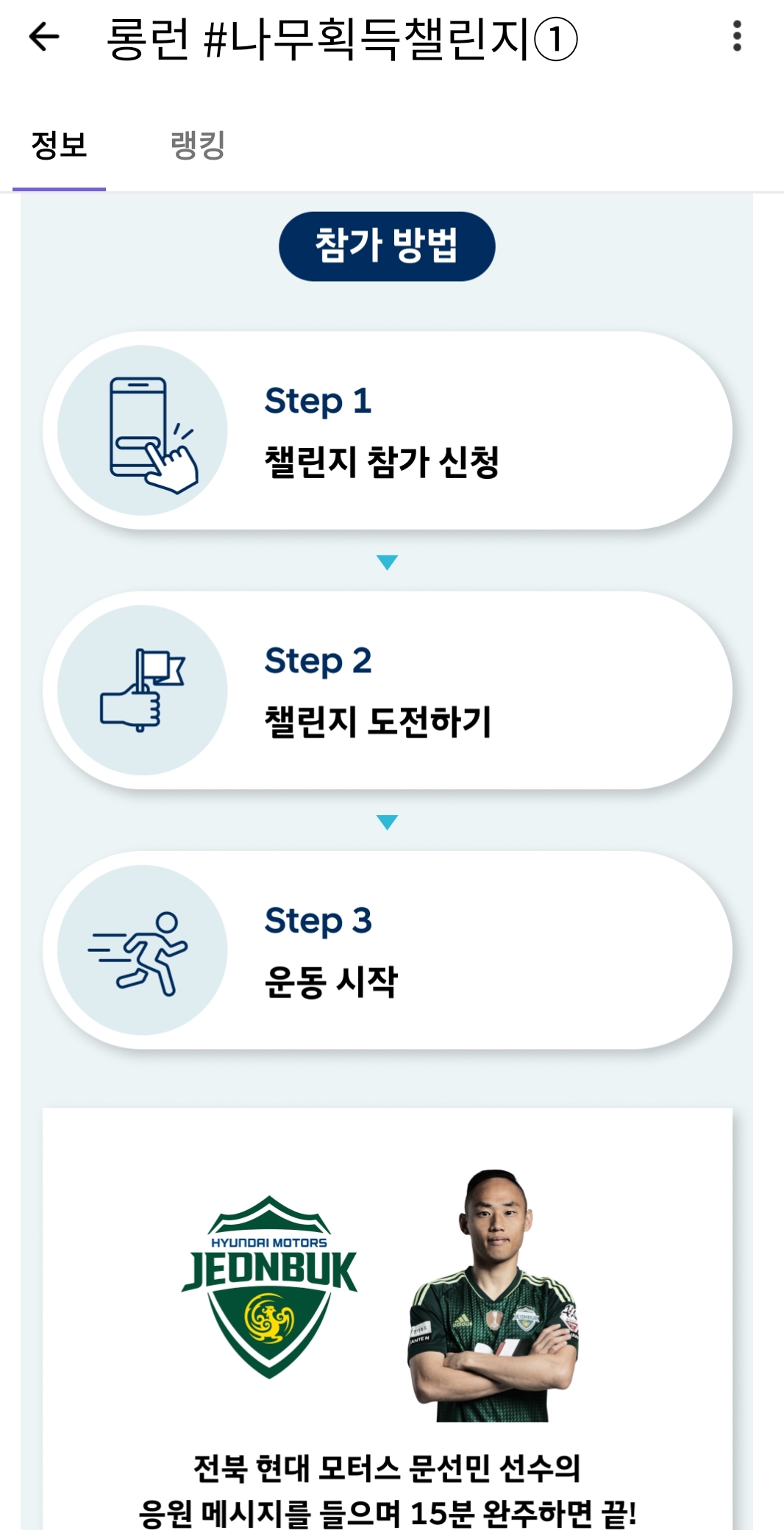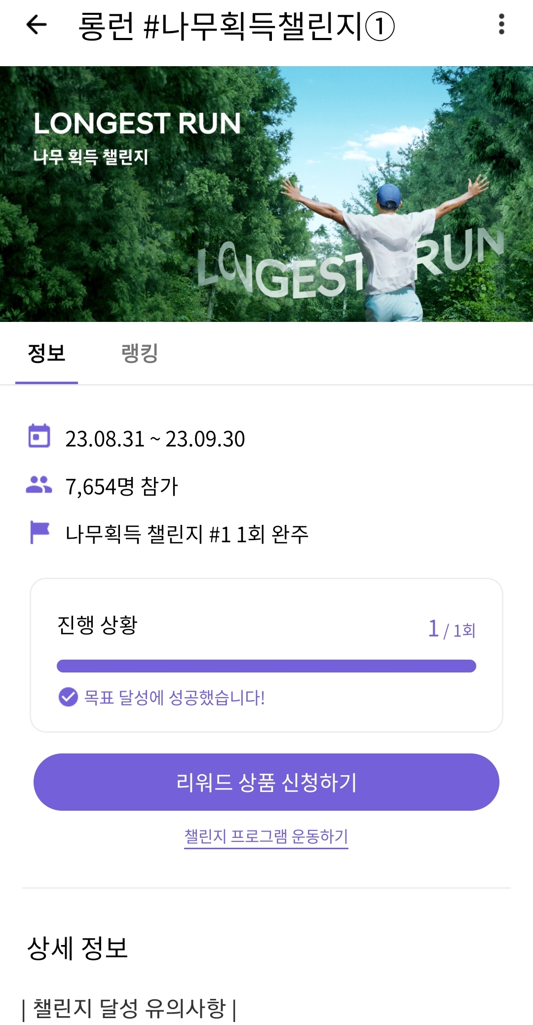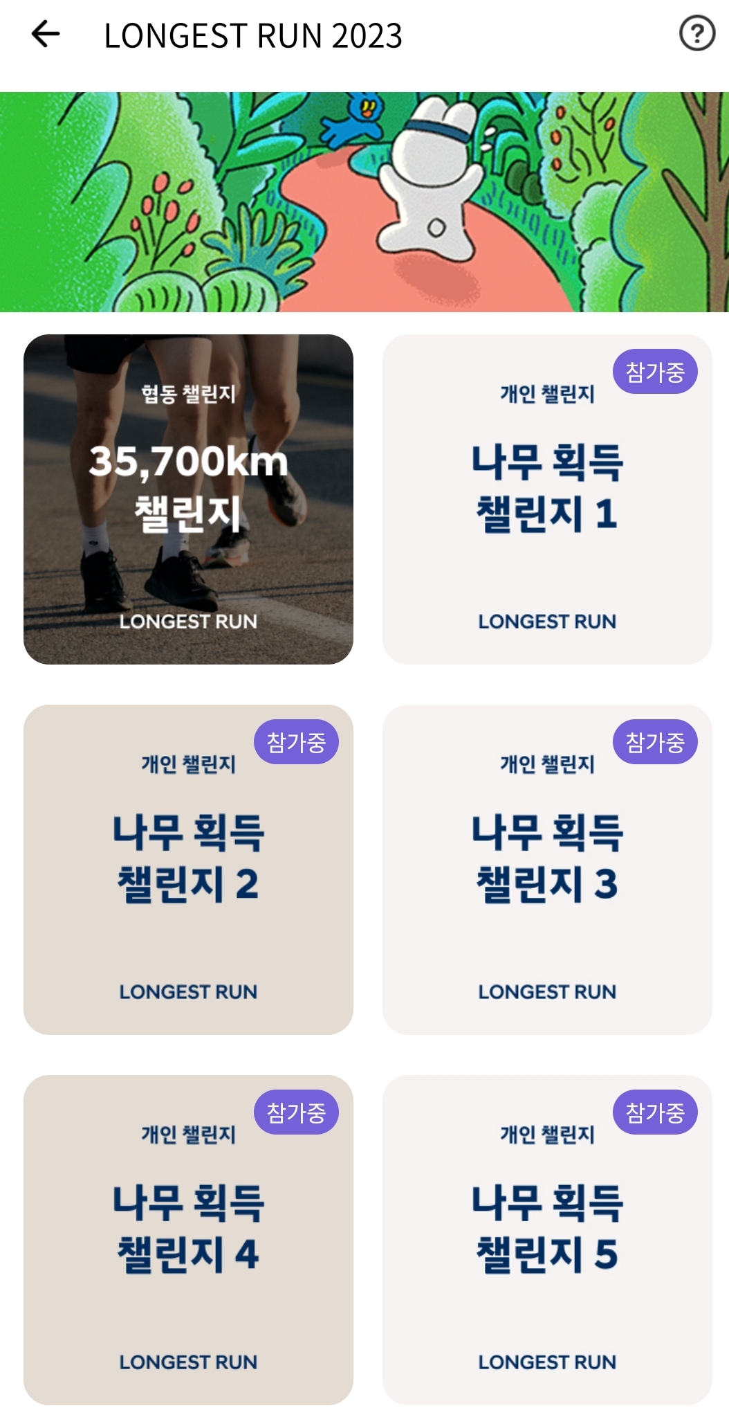 하나의 챌린지는 15분간 달리기 하시면 나무 1개를 획득하게 되고,