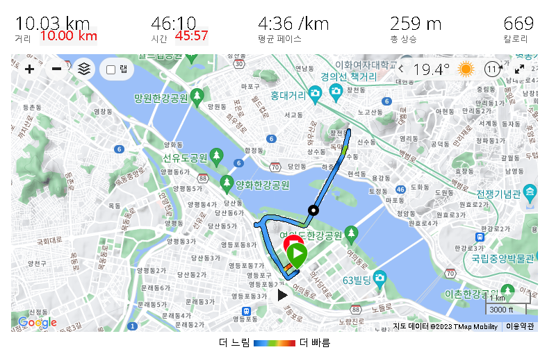 목표 페이스보다, 13초 빠른 4분 35초 페이스로 완주를 하였습니다.
