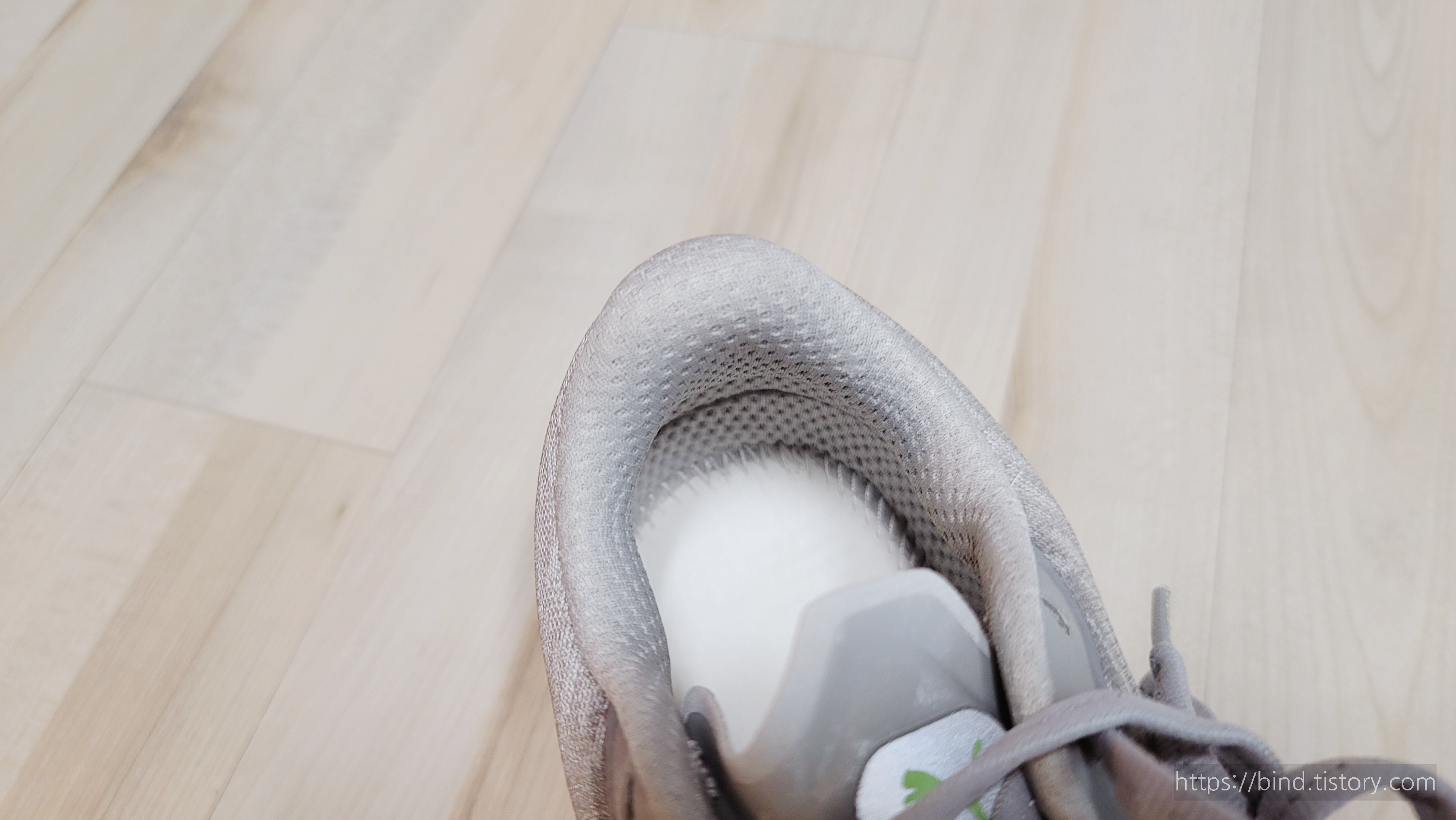 손을 넣어 살펴보니, 어퍼인 엔지니어드 매쉬가 이중으로 되어 있는 부분이 떨어진 것처럼 너덜합니다.