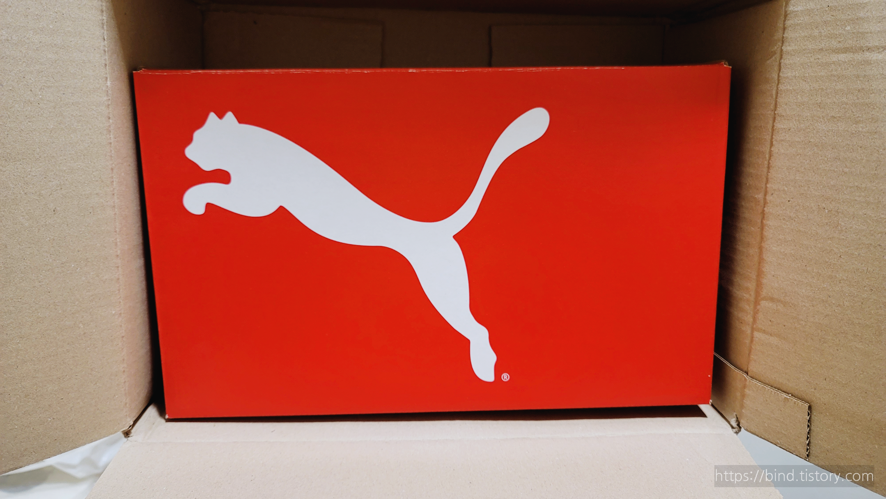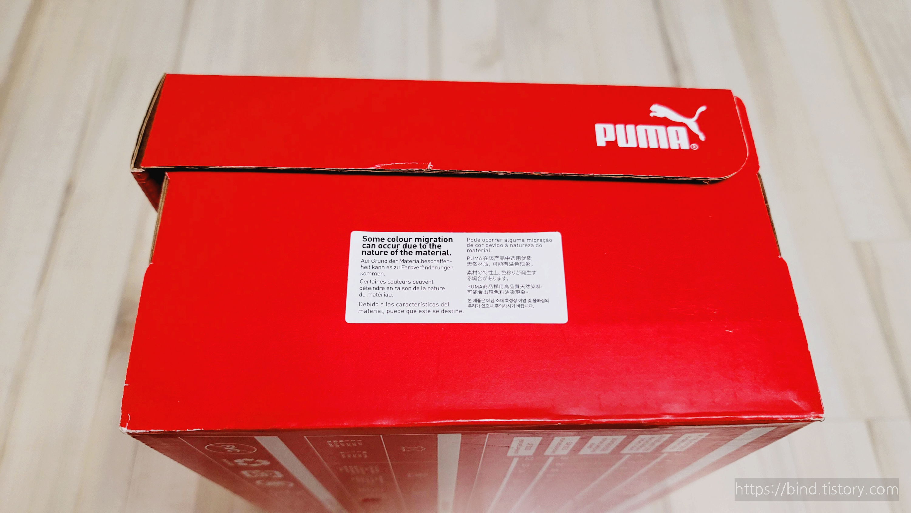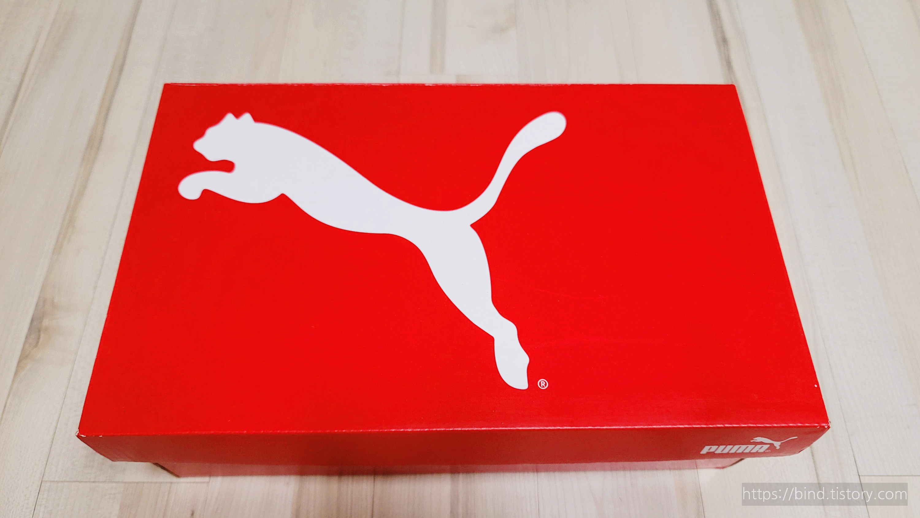 푸마 로고와 함께 빨간 상자 신발 상자가 들어있습니다.