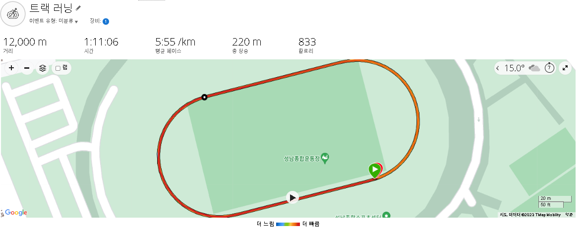 아직 심박수를 더 낮춰야겠지만, 오랜만에 트랙에서 홀로 즐겁게 뛰었습니다. ^^