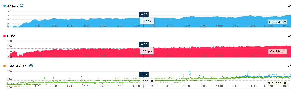 다행히 평균 페이스는 5분55초로 기분좋게 뛰어졌네요.