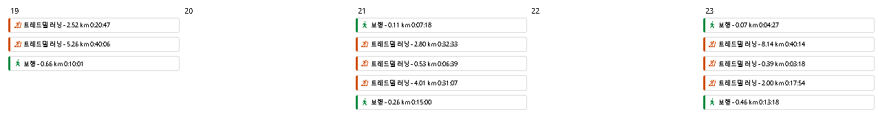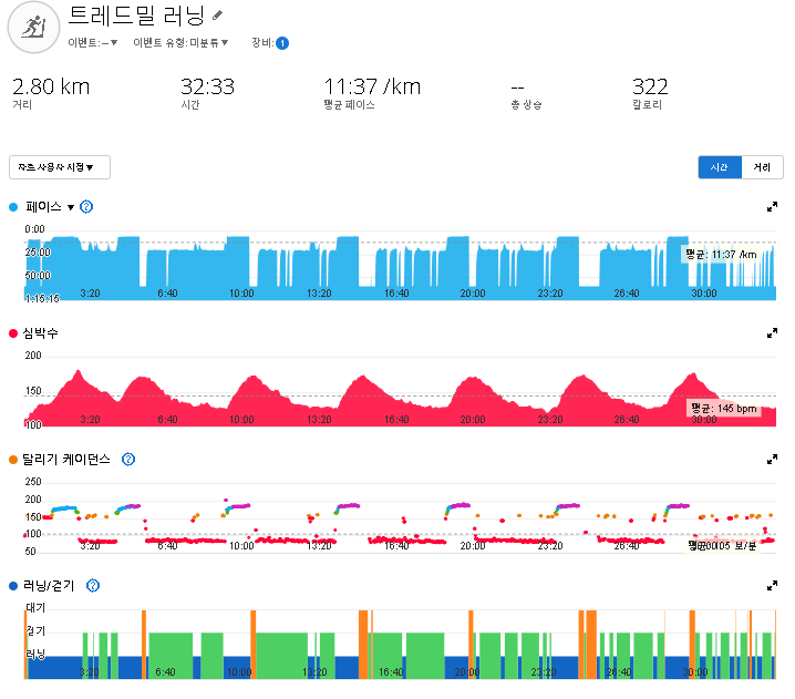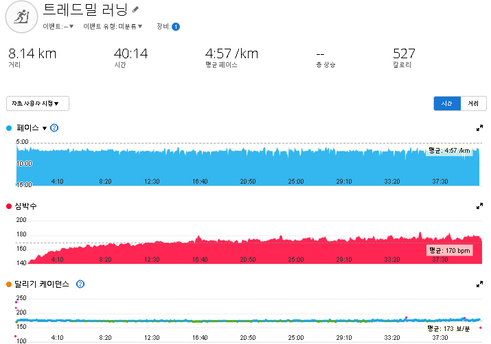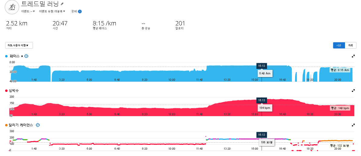 * 1.2km 속도 15로 뛰기 (4분 페이스) - 힘들었지만 몸이 많이 올라오고 있음.