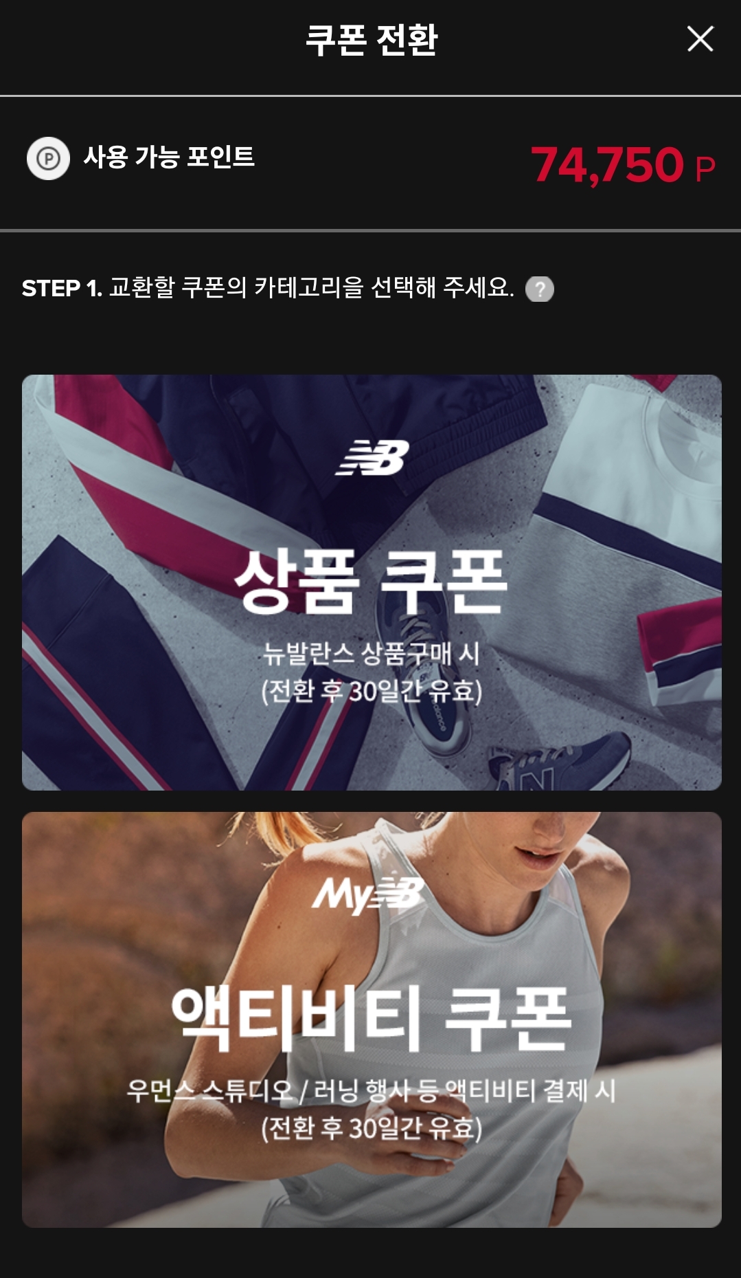 뉴발란스 포인트 5만 점을 이용해서, 미리 액티비티 쿠폰을 5만 원으로 교환해 줍니다.