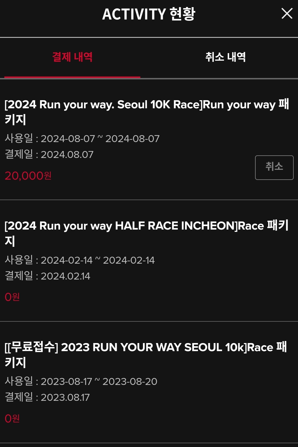 이번 RYW 2024 10K는 대회비가 7만 원이며, 액티비티 쿠폰은 7만원이 없어서 5만 원으로 교체한 후 2만 원 카드로 결제합니다.