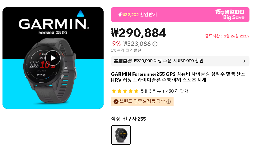 저는 이미 1월에과 2월에 제꺼와 와이프님 가민 포러너 255로 구매를 하여, 2025년 3월 16일 서울마라톤에서 착용하였습니다.