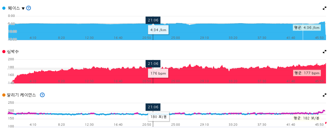 목표 페이스보다, 13초 빠른 4분 35초 페이스로 완주를 하였습니다.